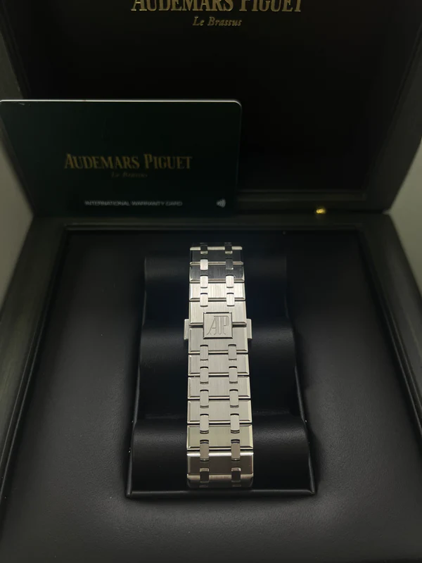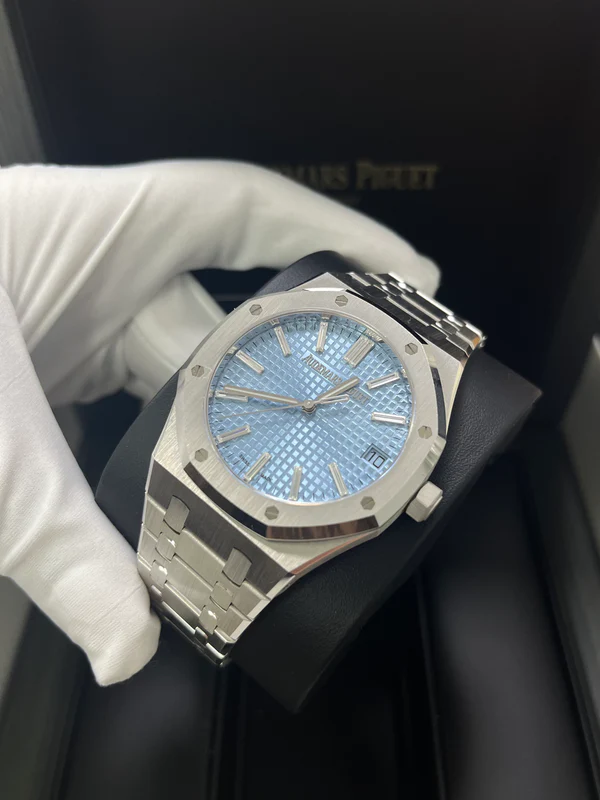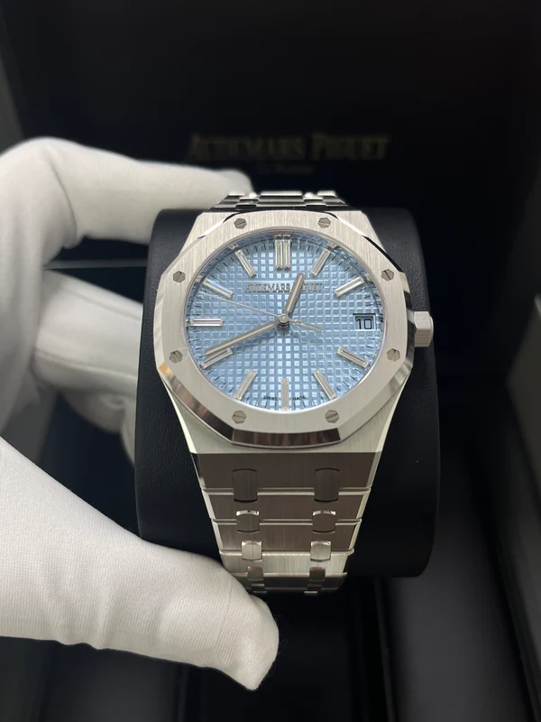 Light blue dial with “Grande Tapisserie” pattern, baguette-cut diamond hour-markers and white gold Royal Oak hands with luminescent coating.