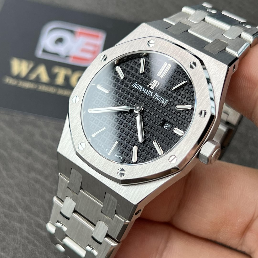 33 mm stainless steel case, 7 mm thick, glareproofed sapphire crystal, black dial with Grande Tapisserie” pattern, white gold applied hour-markers and Royal Oak hands with luminescent coating, Calibre 2713 quartz movement with hours, minutes, date, stainless steel bracelet, AP folding buckle.