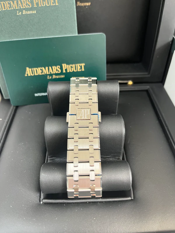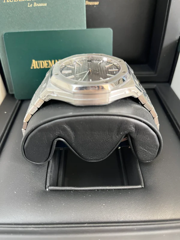 Grey dial with “Grande Tapisserie” pattern, white gold applied hour-markers and Royal Oak hands with luminescent coating.