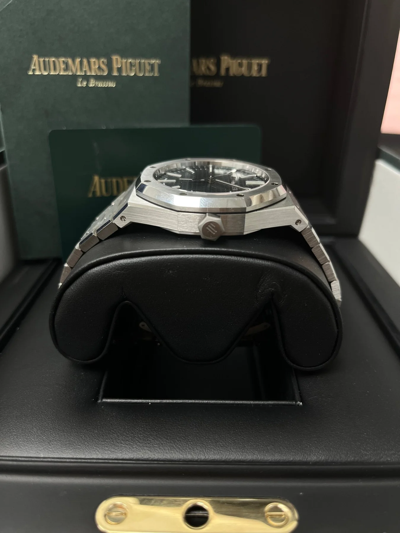 Khaki green dial with “Grande Tapisserie” pattern, white gold applied hour-markers and Royal Oak hands with luminescent coating.