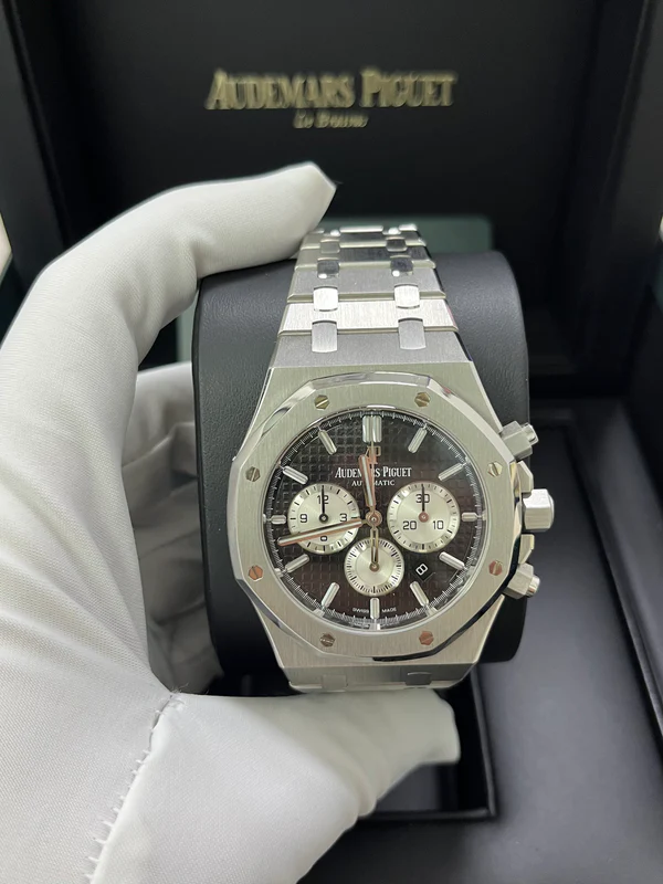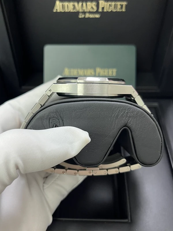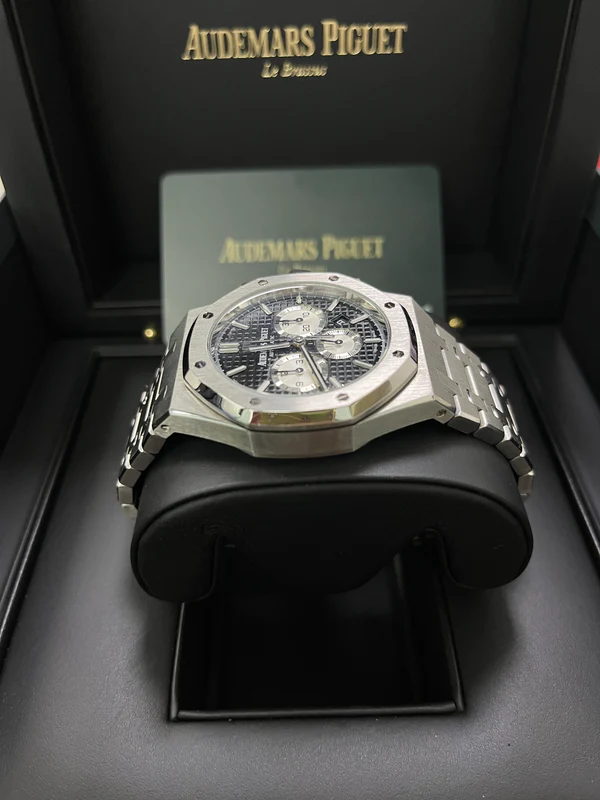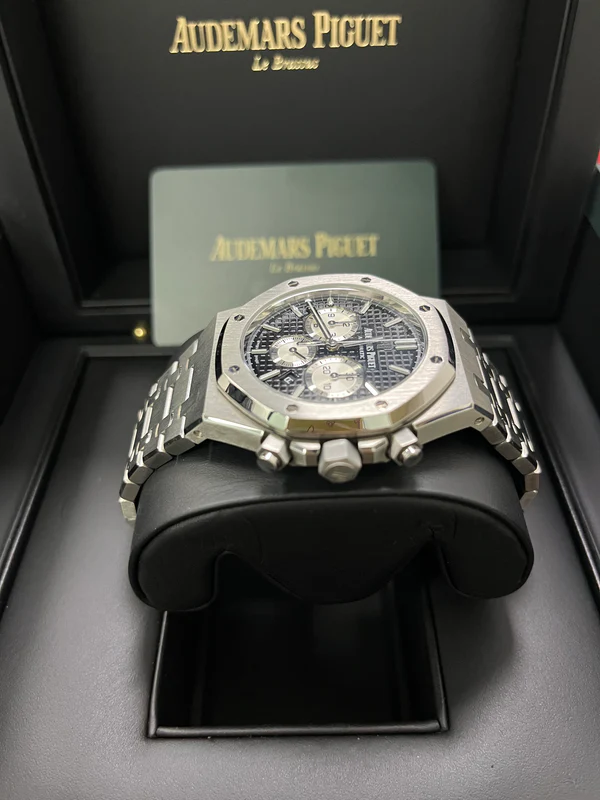 Black dial with “Grande Tapisserie” pattern, silver-toned counters, white gold applied hour-markers and Royal Oak hands with luminescent coating.