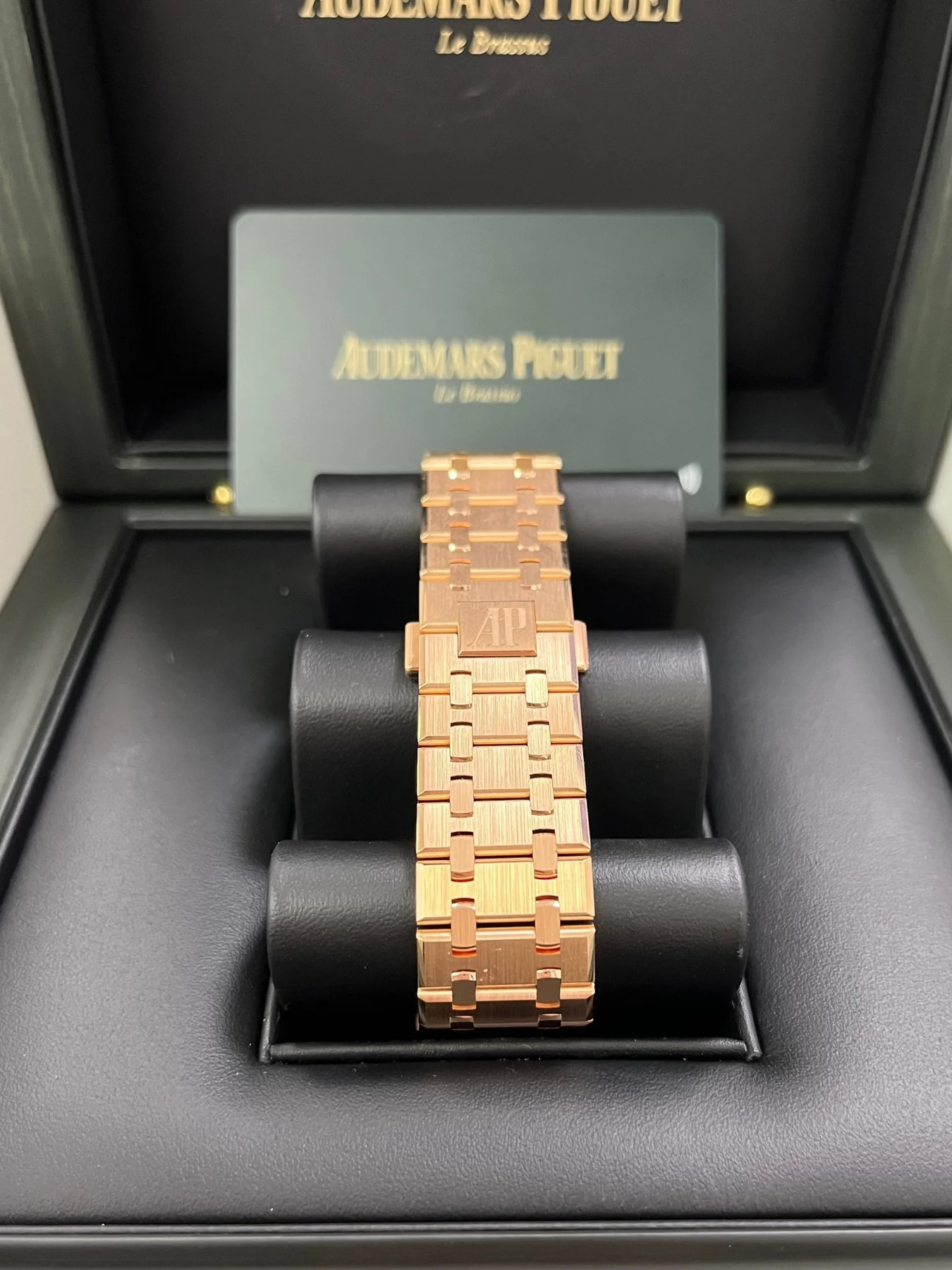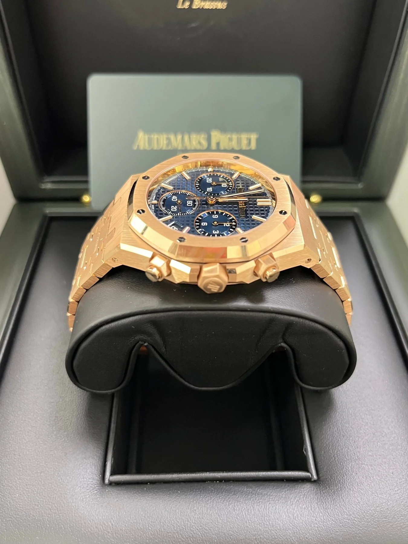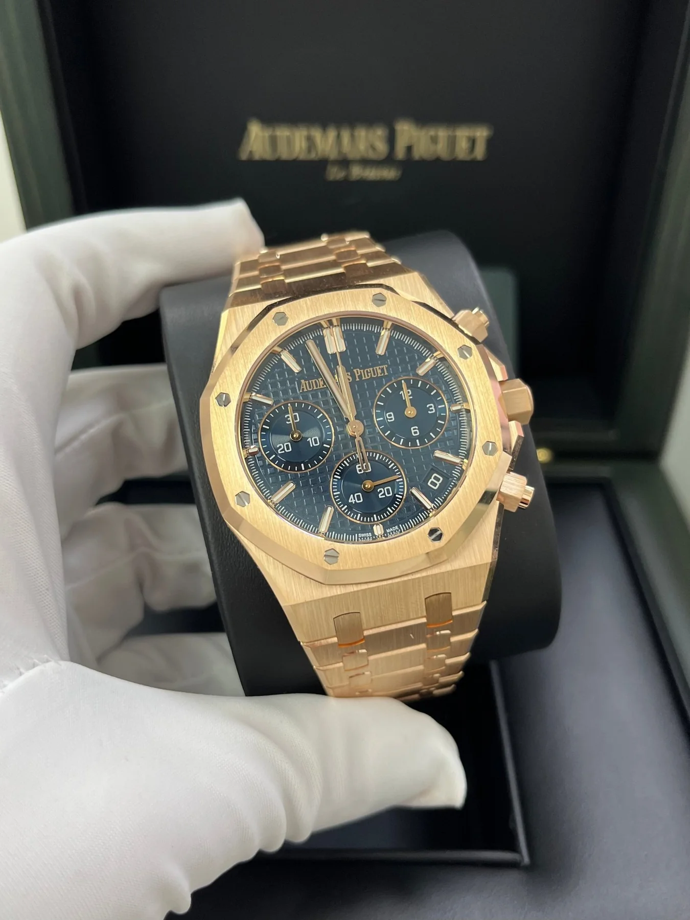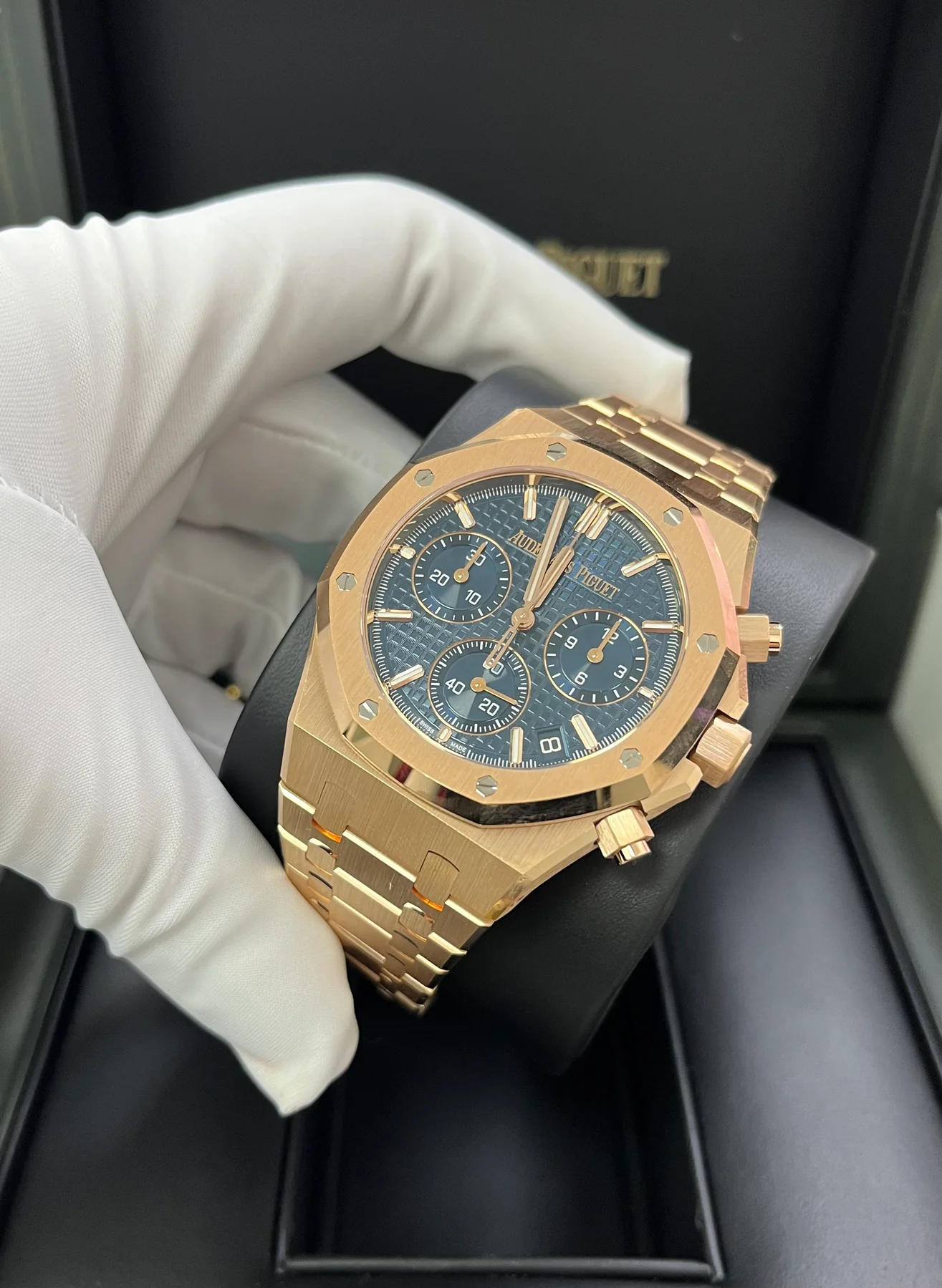 “Bleu nuit nuage 50” dial with “Grande Tapisserie” pattern, “Bleu nuit nuage 50” counters, pink gold applied hour-markers and Royal Oak hands with luminescent coating.