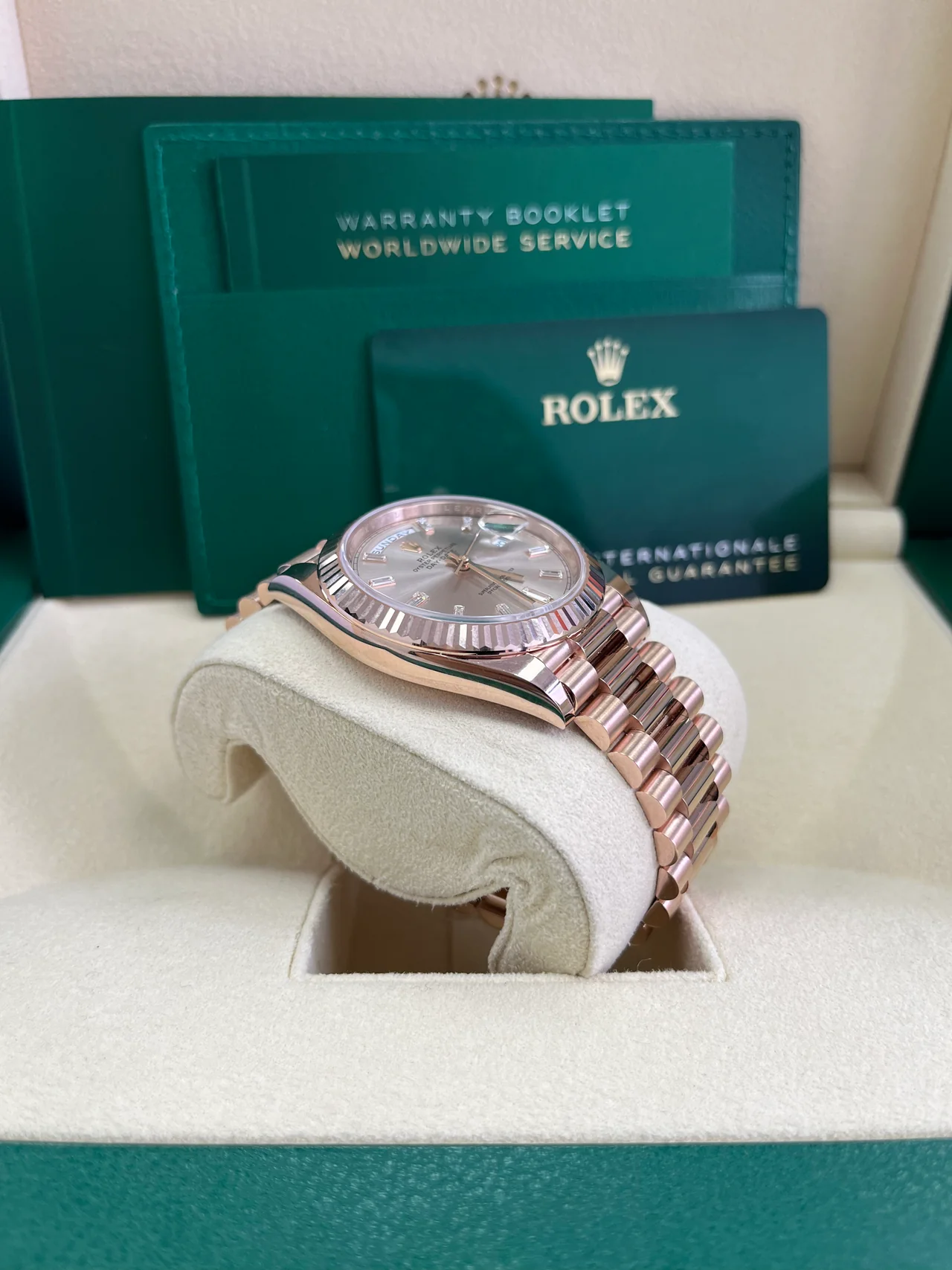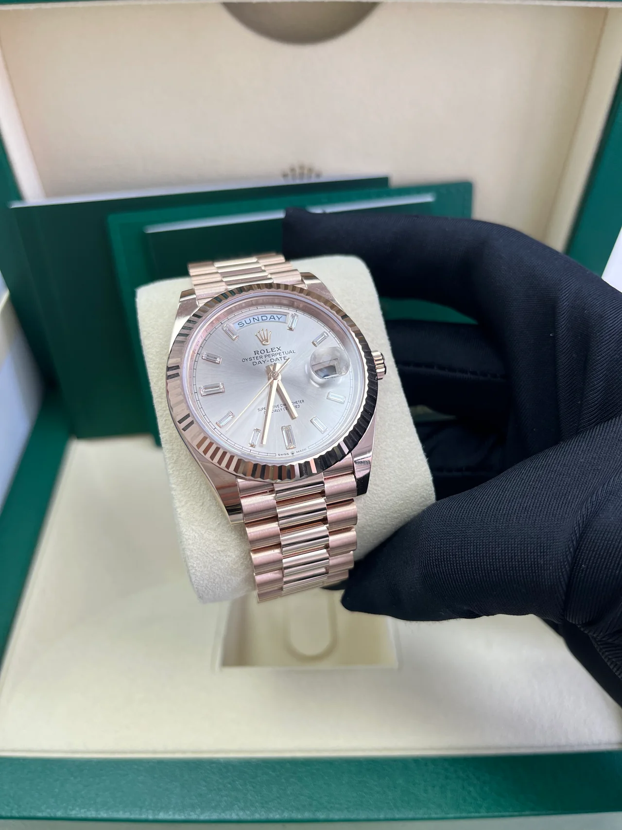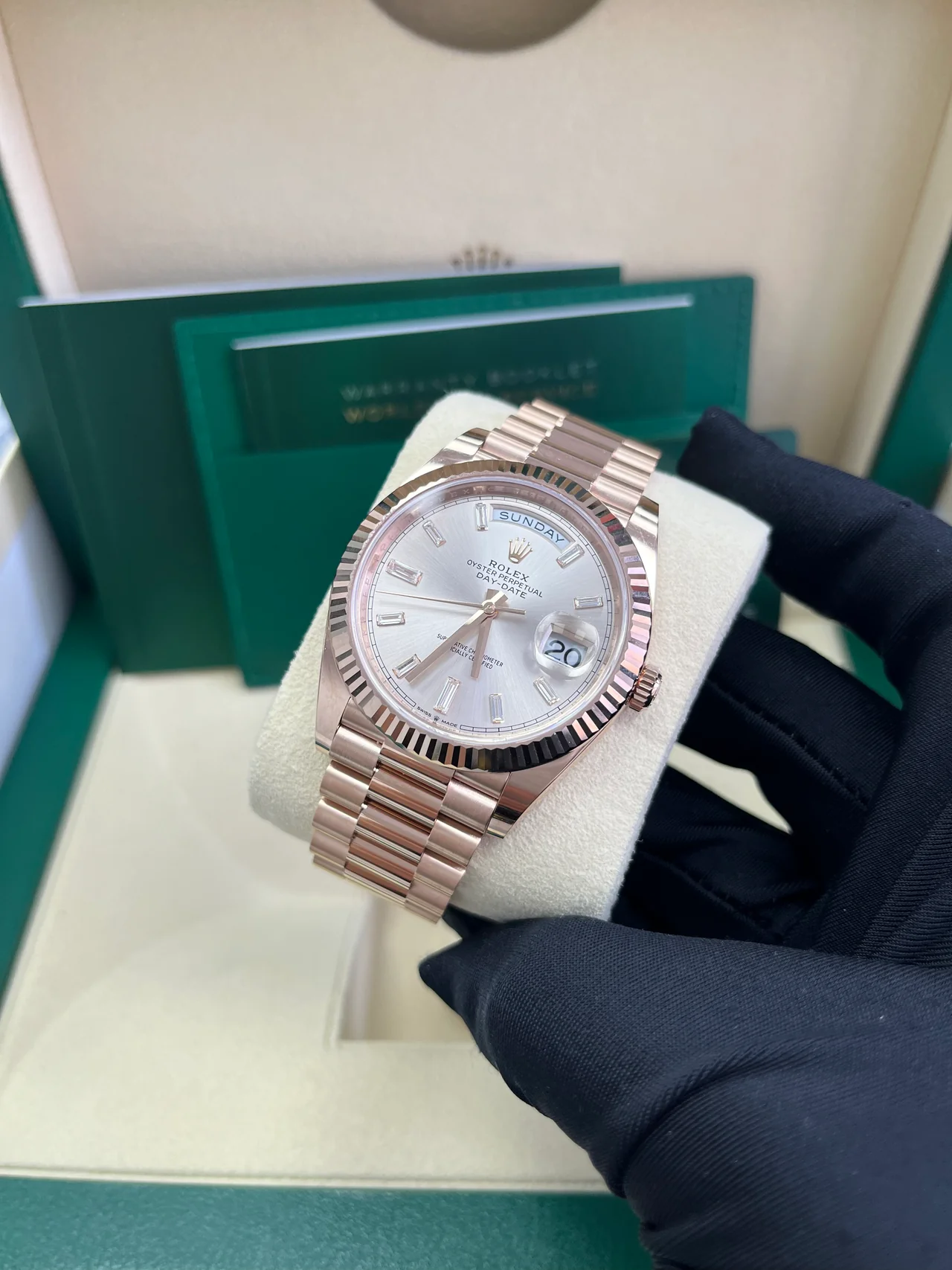 Model: Rolex Day-Date 40 Sundust Baguette Diamond Dial | 18K Everose Gold