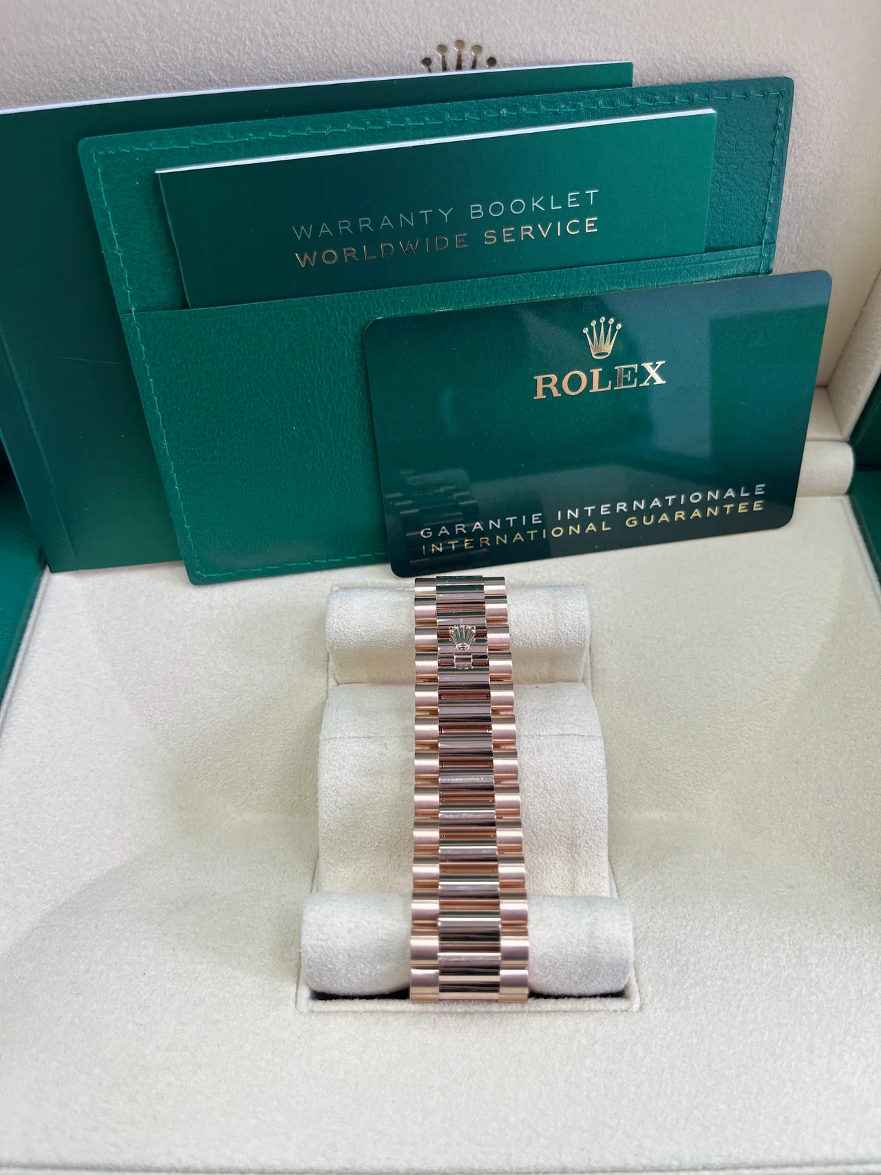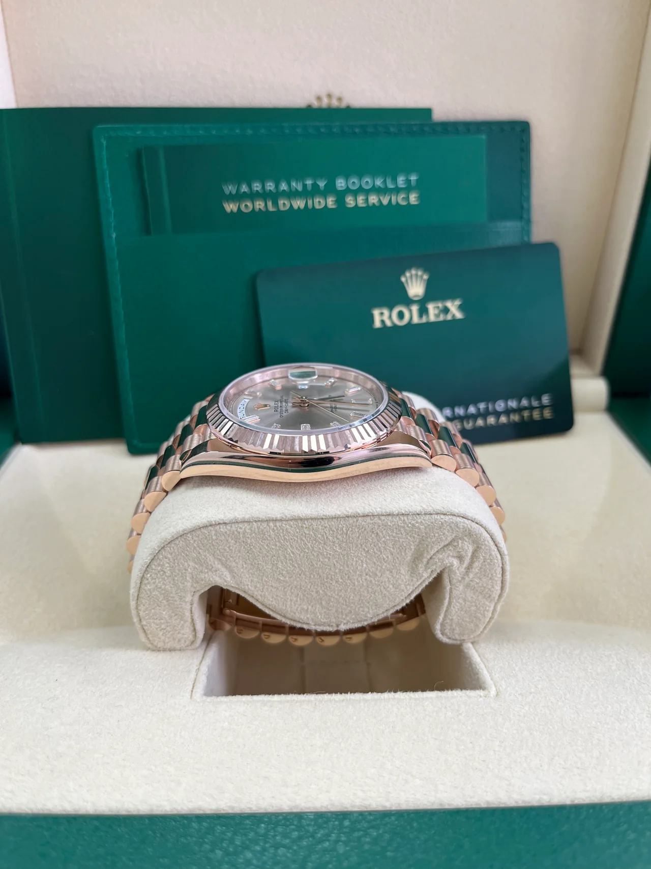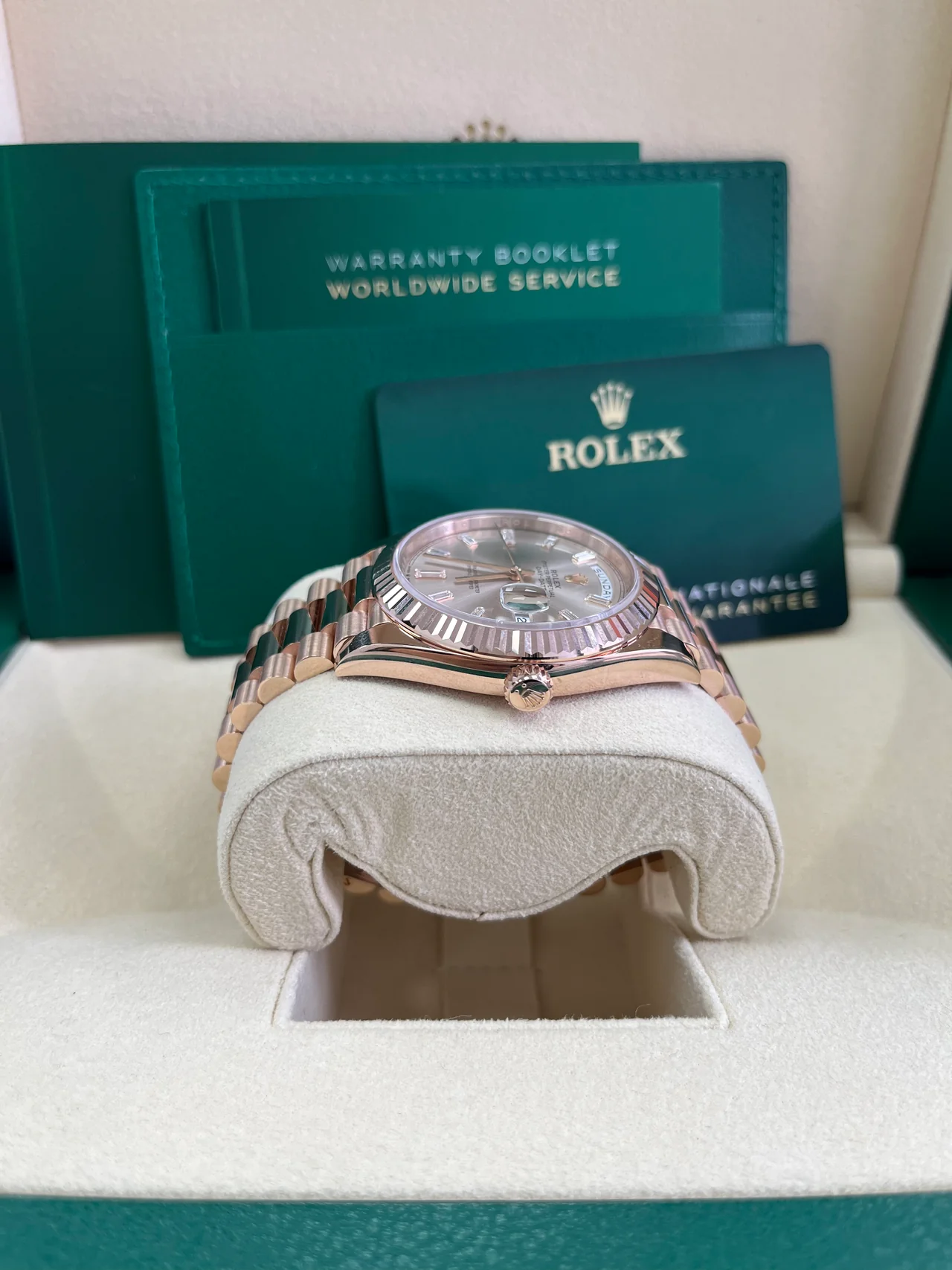 Model: Rolex Day-Date 40 Sundust Baguette Diamond Dial | 18K Everose Gold