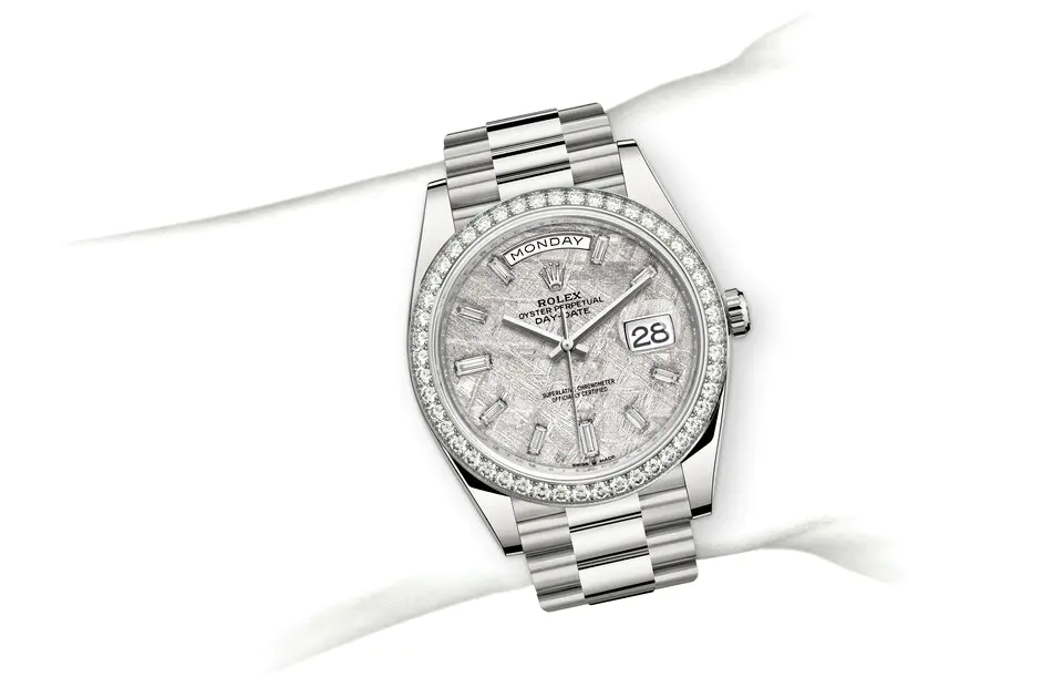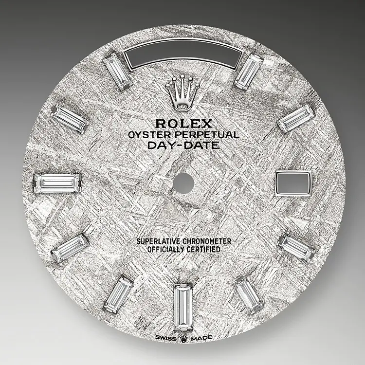 This dial features 10 baguette-cut diamonds. Formed in the far reaches of the solar system, metallic meteorite comes from an asteroid that exploded millions of years ago. On the voyage between planets, fragments of this natural extraterrestrial material, primarily composed of iron and nickel, cool by a few degrees Celsius every million years, creating unique, distinctive crystallization within the material that is impossible to recreate on Earth. Metallic meteorite is rare and challenging to work with, but once it is cut into thin sections and a chemical treatment is applied, the great beauty of its interwoven internal structure is revealed. These fascinating and varied formations are known as Widmanstätten patterns. For its dials, Rolex works with leading experts in the field and selects only the sections of meteorite with a particularly well-formed surface rich in different shapes and reflections.