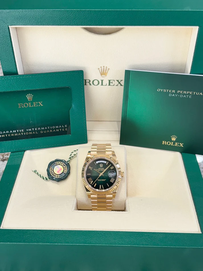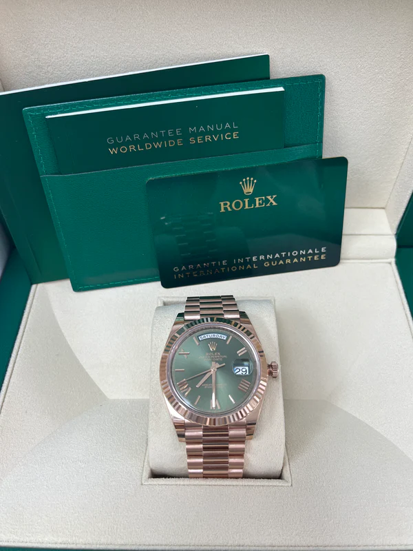 Day Date 40mm - Ref 228235-0025 - Olive Green Roman Dial & Fluted Bezel, 18K Rose Gold President Bracelet Men's Watch