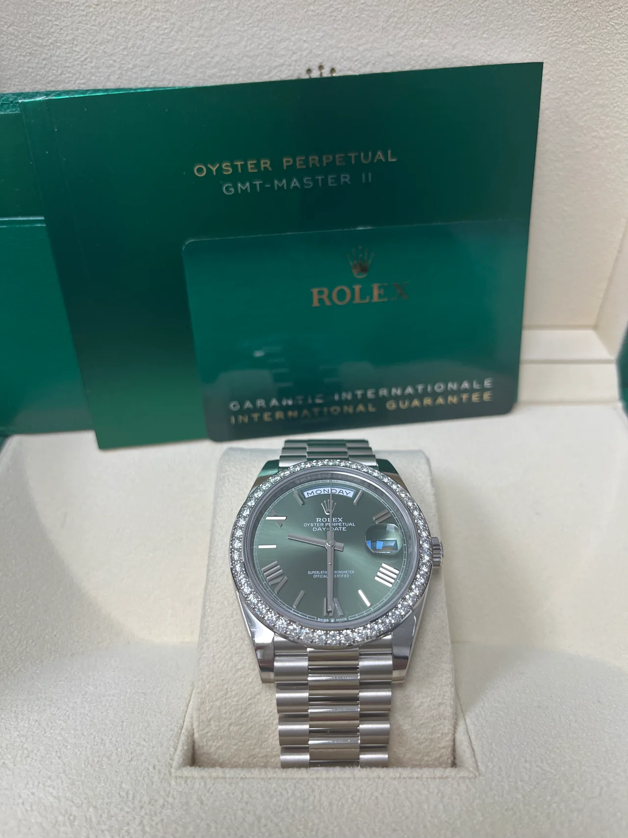 Day Date 40mm Diamonds - Ref 228349rbr-0030 - Olive Green Roman Dial & Diamond Bezel, 18K White Gold President Bracelet Men's Watch