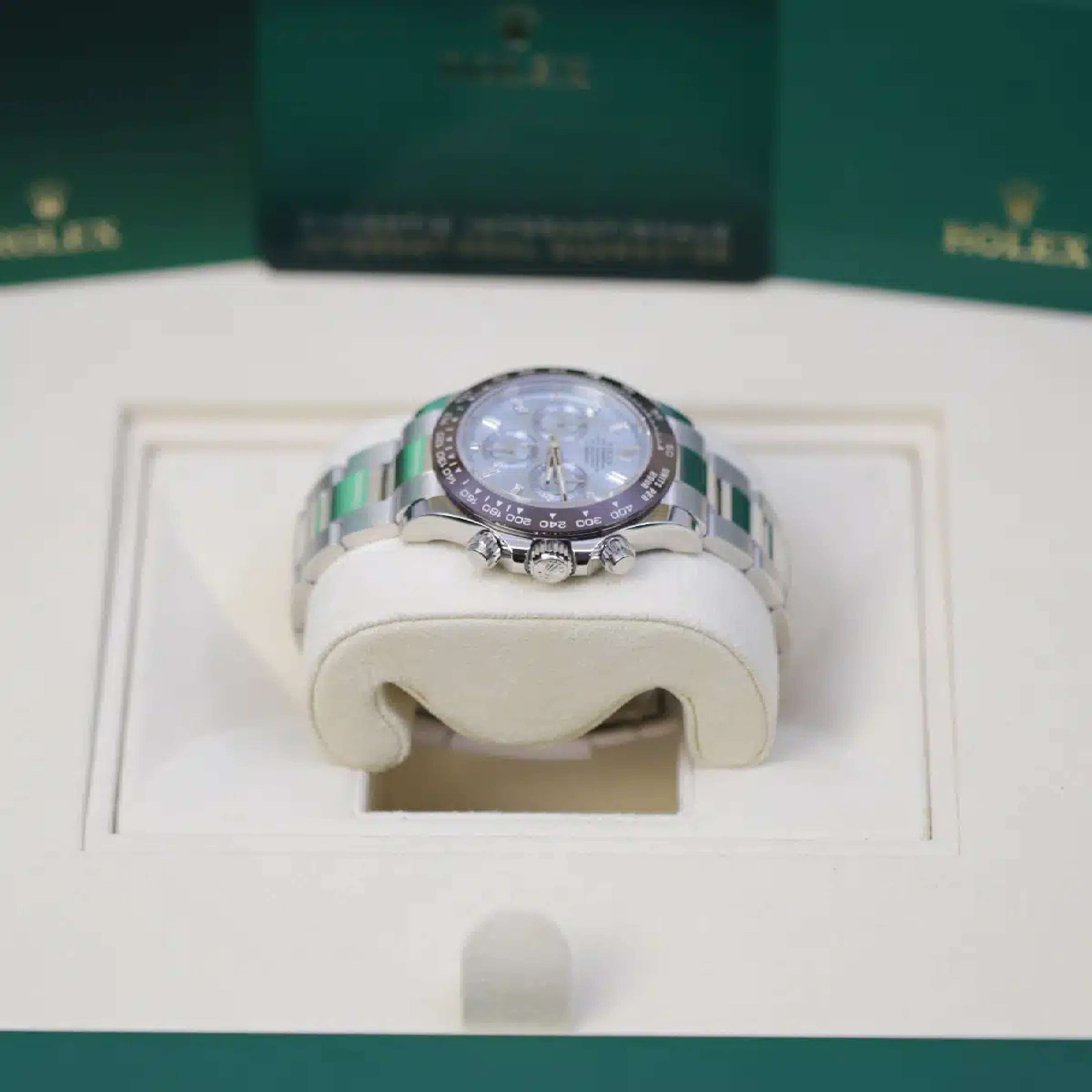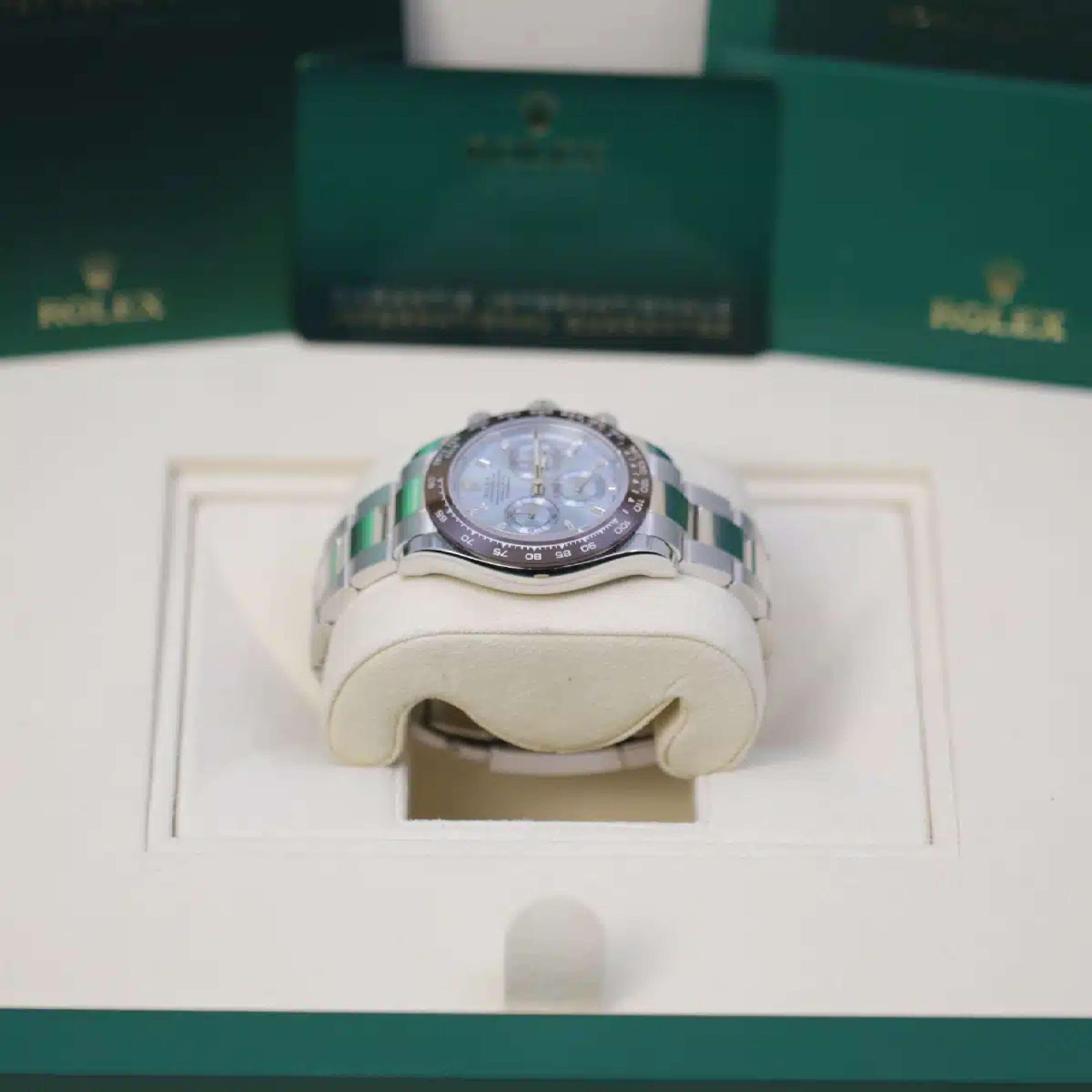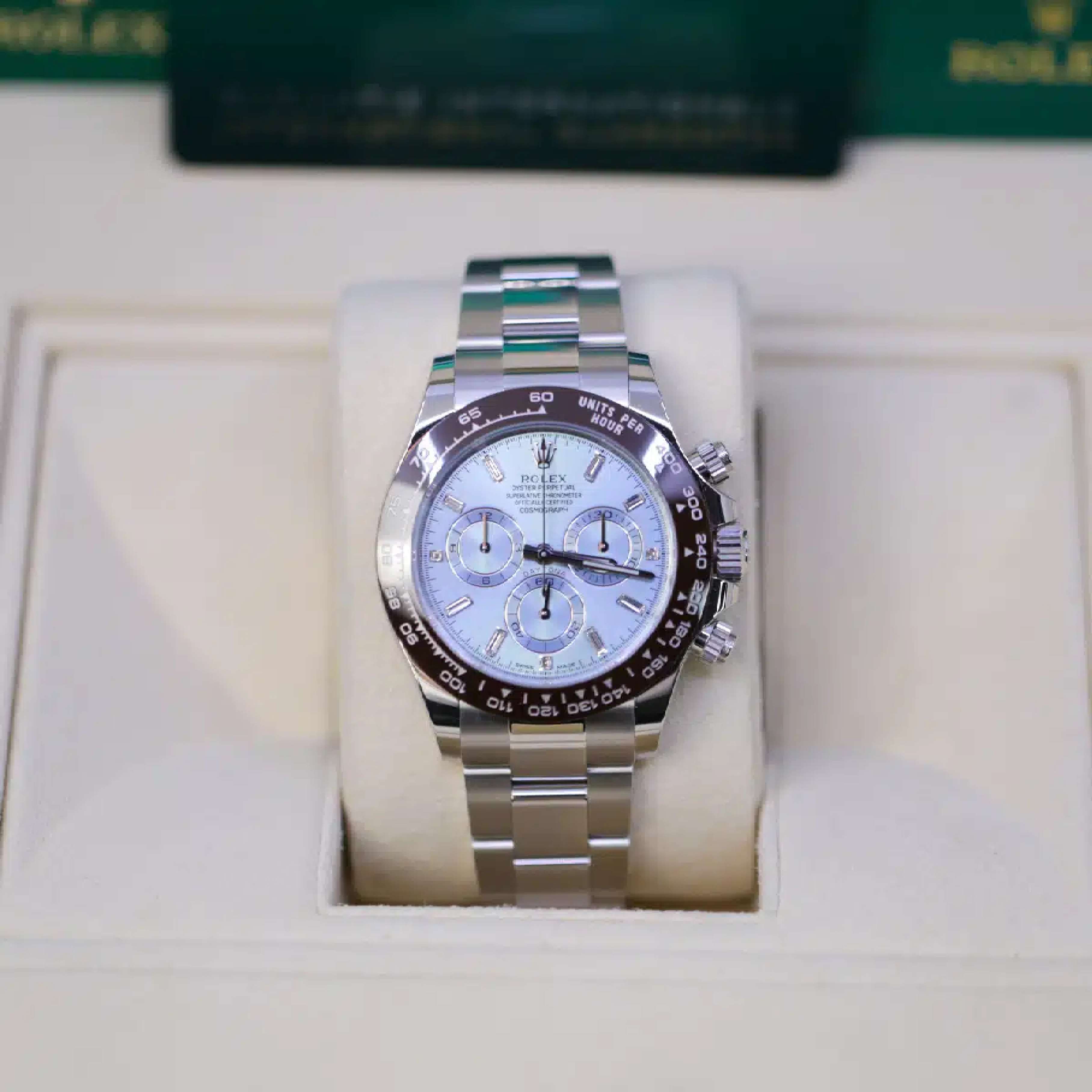 Model: Rolex Cosmograph Daytona 40mm, Ice Blue Dial, Ceramic Bezel, Platinum, Oyster Bracelet Watch 116506