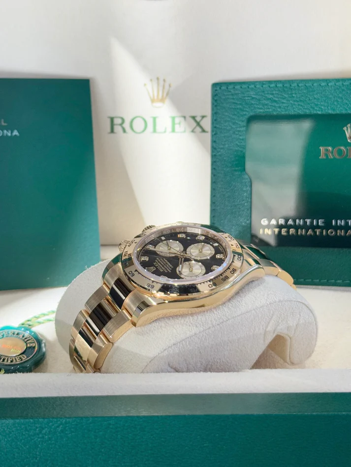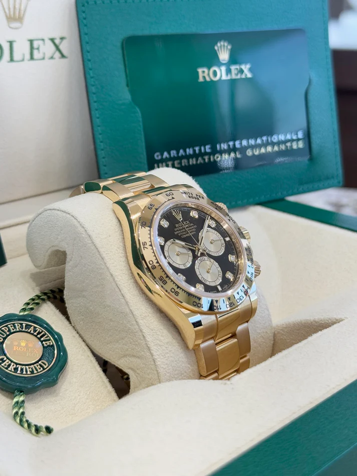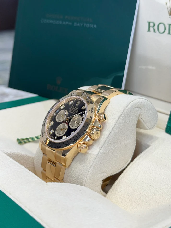 Model: Rolex Cosmograph Daytona 40mm 18k Yellow Gold with Bright Black Dial and Diamonds, Reference # 126508