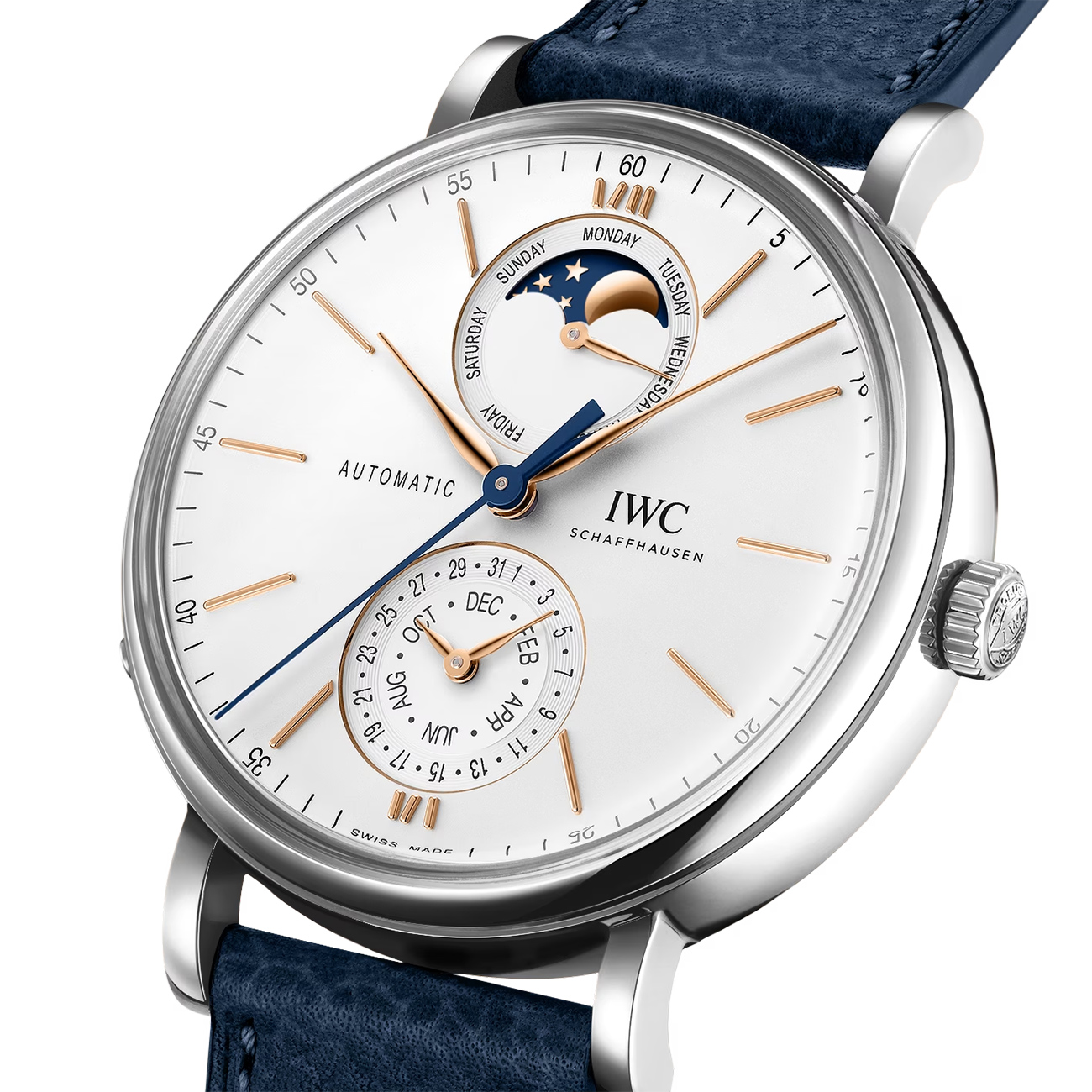 This IWC Portofino Automatic 41mm is a watch with timeless elegance, featuring a Perpetual calendar with displays for the date, day, month and perpetual moon phase; All of which is attached to a Blue leather strap. Along with a power reserve of 72 hours, the Portofino Automatic is powered by the 32150 Calibre movement.