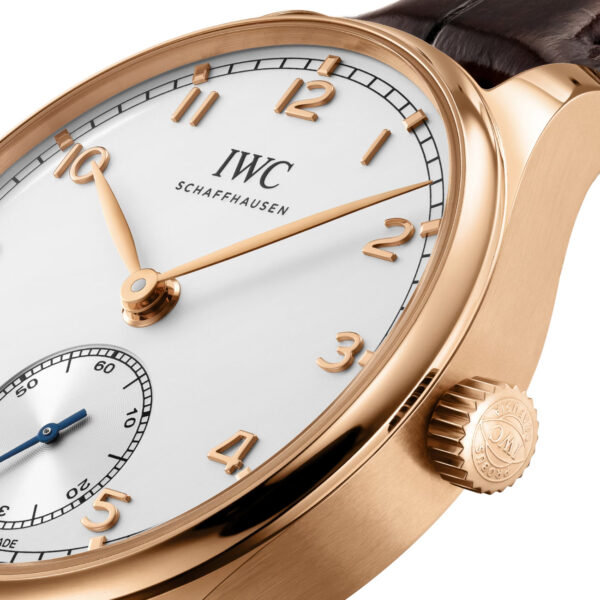 This IWC Portugieser Automatic 40mm is designed for legibility, featuring a clean silver dial with a small seconds counter at 6 o’clock, contrasted with gold-plated hands and appliques on a compact 18K gold case. Fitted on a dark brown alligator leather strap with a folding clasp for extra comfort. Powered by the IWC-manufactured 82200 Calibre, visible through the open sapphire case back, offering up to 60 hours power reserve.