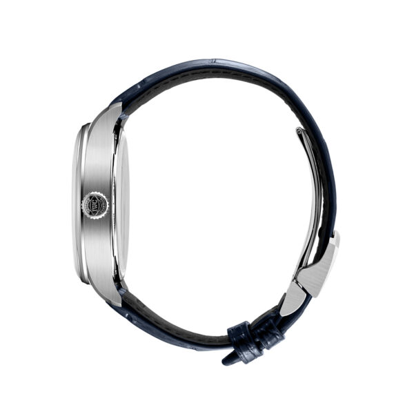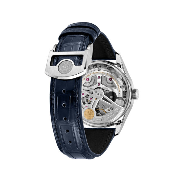 This IWC Portugieser Automatic 42.4mm is a true icon that showcases the unmistakable design cues of a typical IWC Portugieser. It features a silver dial with an iconic railway track chapter ring, blue-tone appliqued numerals and elegant feuille hands. The balanced dial design retains the classic appeal of the original timepiece from the 1930s, with two subdials displaying the small seconds and power reserve and a date display at 6 o’clock. This watch is housed in a steel case and is fitted with a dark blue alligator strap with ergonomically optimised strap horns, ensuring greater comfort even on slimmer wrists. The IWC-manufactured 52011 Calibre powers the watch, offering a remarkable power reserve of 7 days, visible through the sapphire case back.