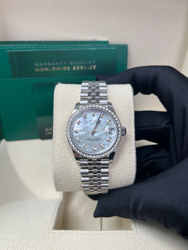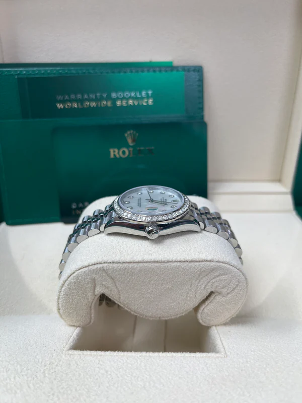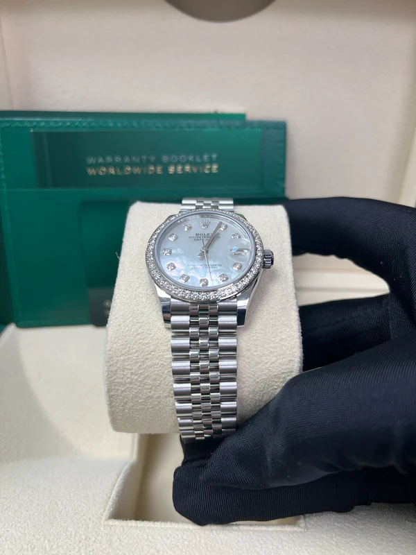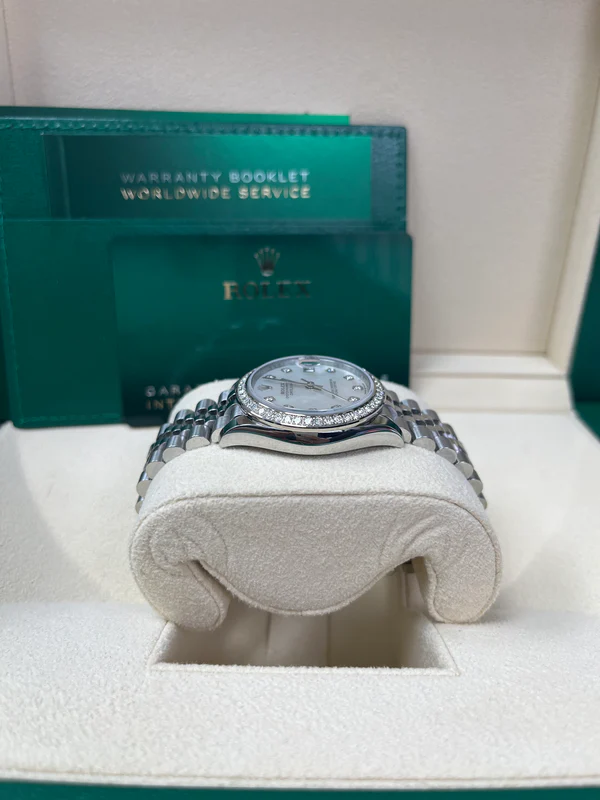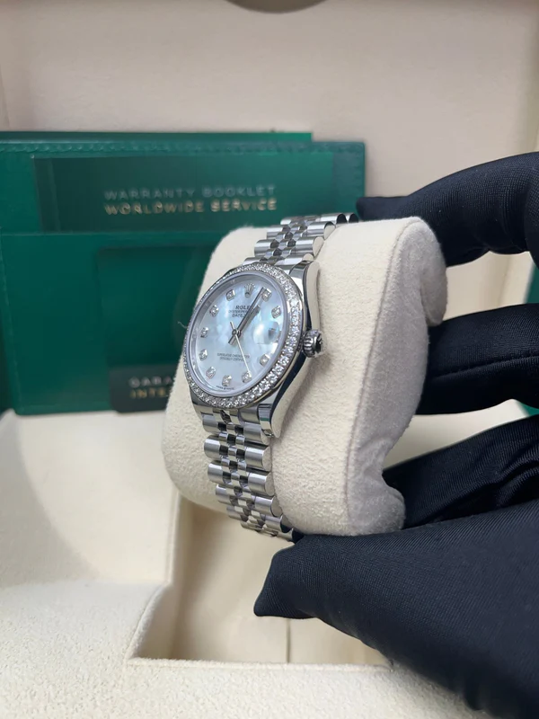 This dial features diamonds in 18 ct gold settings. Mother-of-pearl is by its nature full of mystery and surprises. Depending on its origin, it can be pink, white, black or yellow. It differs in colour, intensity and structure according to the part of the shell from which it is extracted. At Rolex, mother-of-pearl is never artificially coloured. Instead, particular know-how and skill are devoted to simply highlighting its natural beauty and preserving the original hues. As all mother-of-pearl dials are unique pieces, an identical dial will never be found on another wrist.