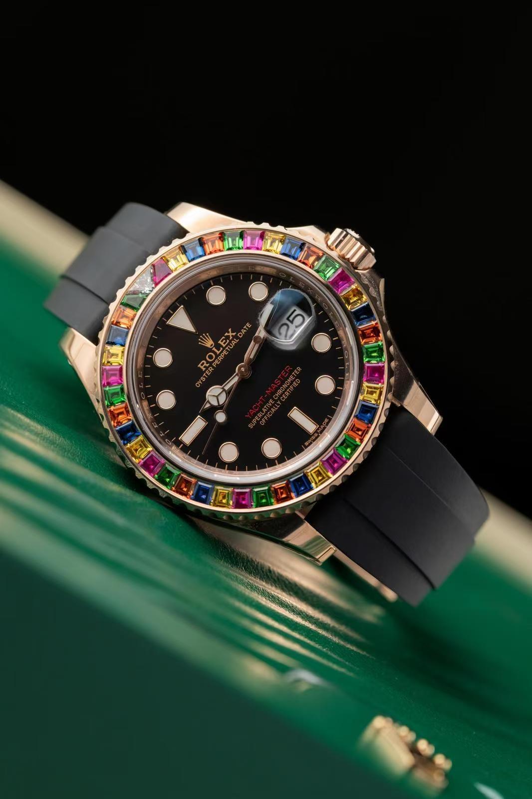Yachtmaster 40mm - Ref 116695 - Black Dial, Gemstone Rainbow Bezel & 18K Rose Gold Case, Black Oysterflex Bracelet Men's Watch