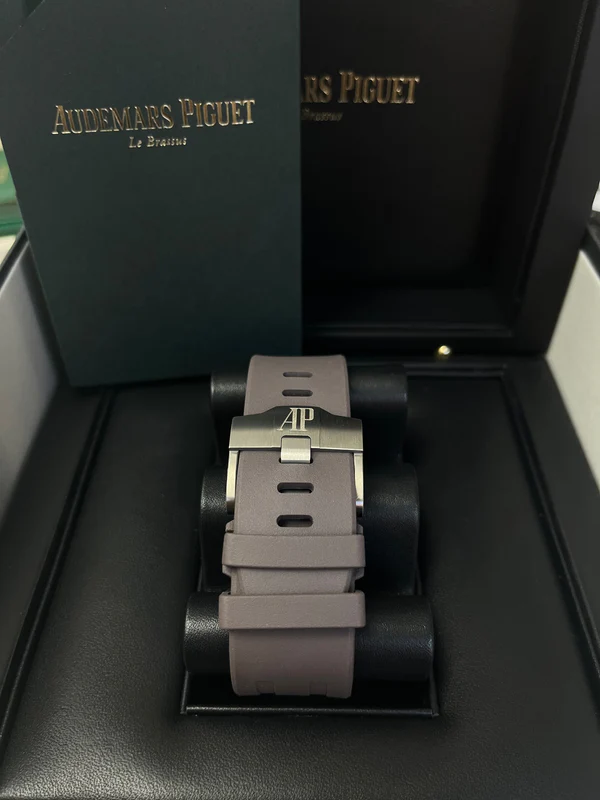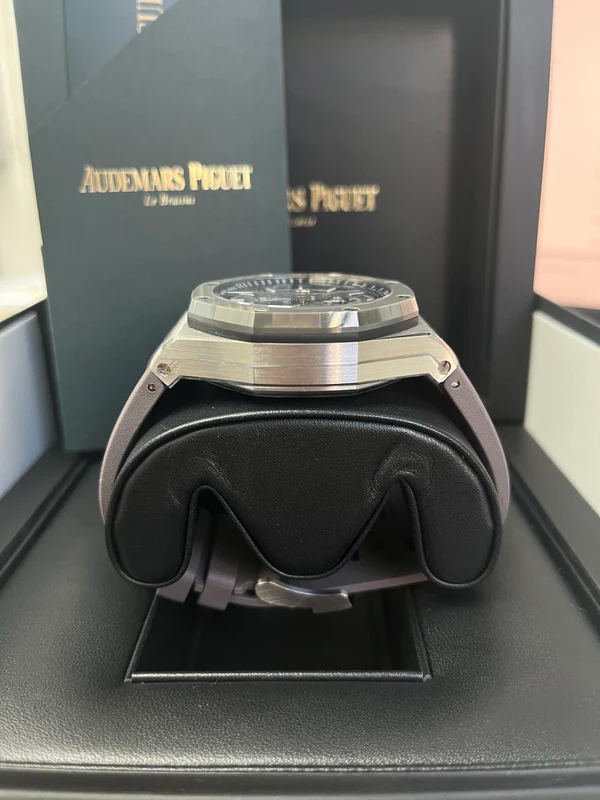 Grey dial with “Mega Tapisserie” pattern, blue counters and blue external zone, white gold applied hour-markers and Royal Oak hands with luminescent coating, blue inner bezel.