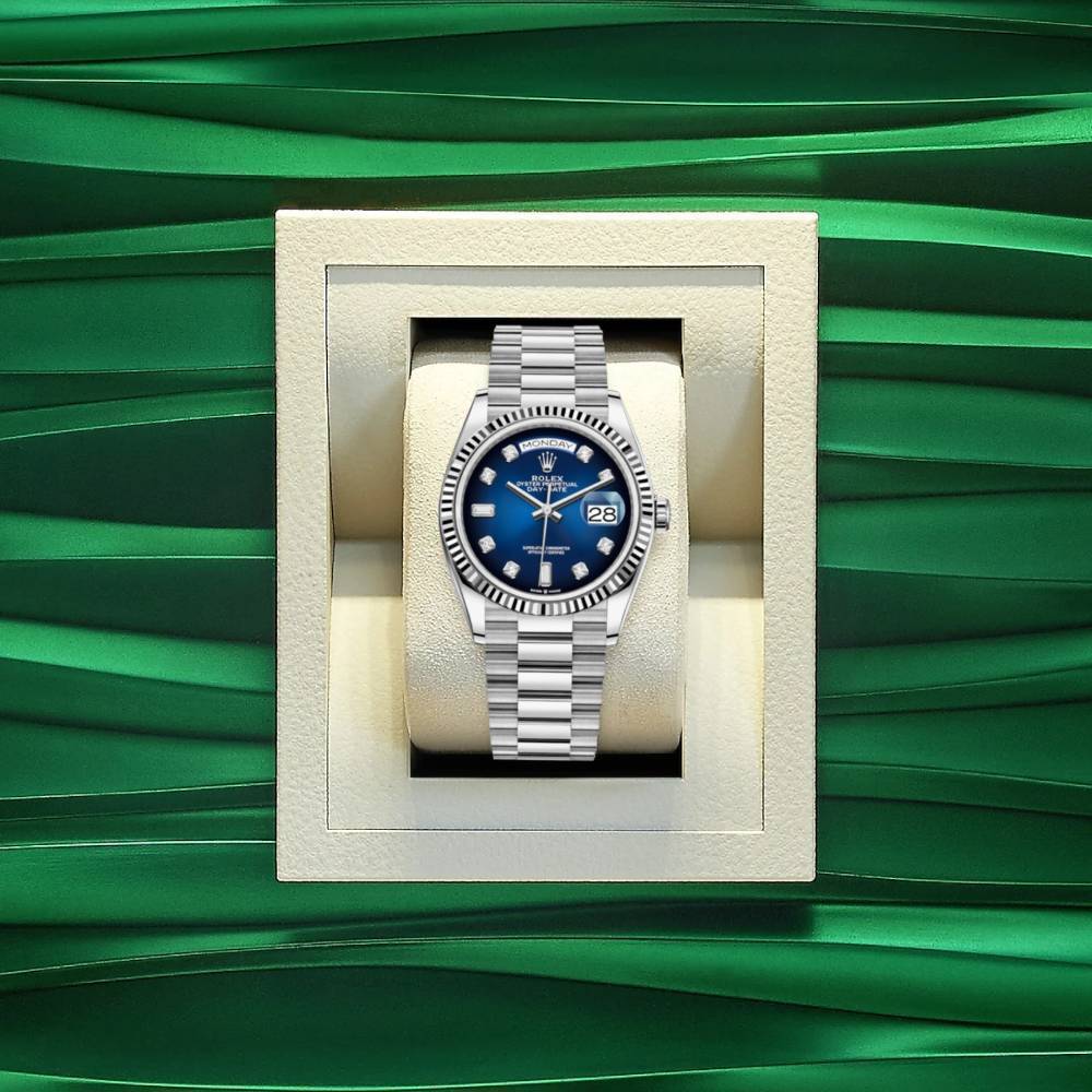 Day Date 36mm Diamonds - Ref 128239-0023 - Blue Ombre Diamond Dial & Fluted Bezel, 18K White Gold President Bracelet Watch