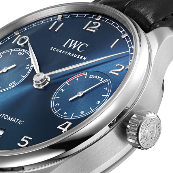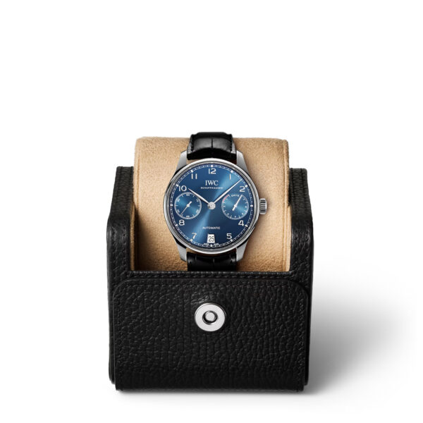 This IWC Portugieser Automatic 42.3mm is a true icon that showcases the unmistakable design cues of a typical IWC Portugieser. It features a blue dial with an iconic railway track chapter ring, silver appliqued Arabic numerals and elegant feuille hands. The balanced dial design retains the classic appeal of the original timepiece from the 1930s, with two subdials displaying the small seconds and power reserve and a date display at 6 o’clock. This watch is housed in a steel case and is fitted with a black alligator strap with ergonomically optimized strap horns, ensuring greater comfort even on slimmer wrists. The IWC-manufactured 52010 Calibre powers the watch and features Geneva stripe decoration, offering a remarkable power reserve of 7 days, visible through the sapphire case back.