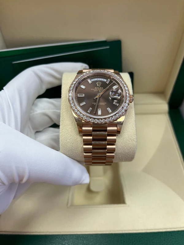 • Everose Gold Day-Date 40 Watch - Everose Gold Bezel - Chocolate Baguette Diamond Dial - President Bracelet (REF#228345RBR)