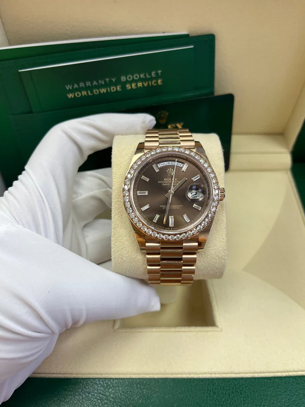 40mm 18K Everose gold case, screw-down back with Rolex fluting, screw-down crown with twinlock double waterproofness system, Everose gold bezel set with 48 diamonds, scratch-resistant double anti-reflective sapphire crystal with cyclops lens over the date, chocolate dial, 10 baguette diamond hour markers, Rolex calibre 3255 automatic movement with centre hour, minute and seconds hands, instantaneous day and date in apertures, unrestricted rapid-setting, and stop-seconds for precise time setting, approximately 70 hours of power reserve, President bracelet with three-piece solid links comprised of a polished center link, satin-finished outer links, and ceramic inserts, concealed folding Crownclasp buckle. Waterproof to 100 meters.
